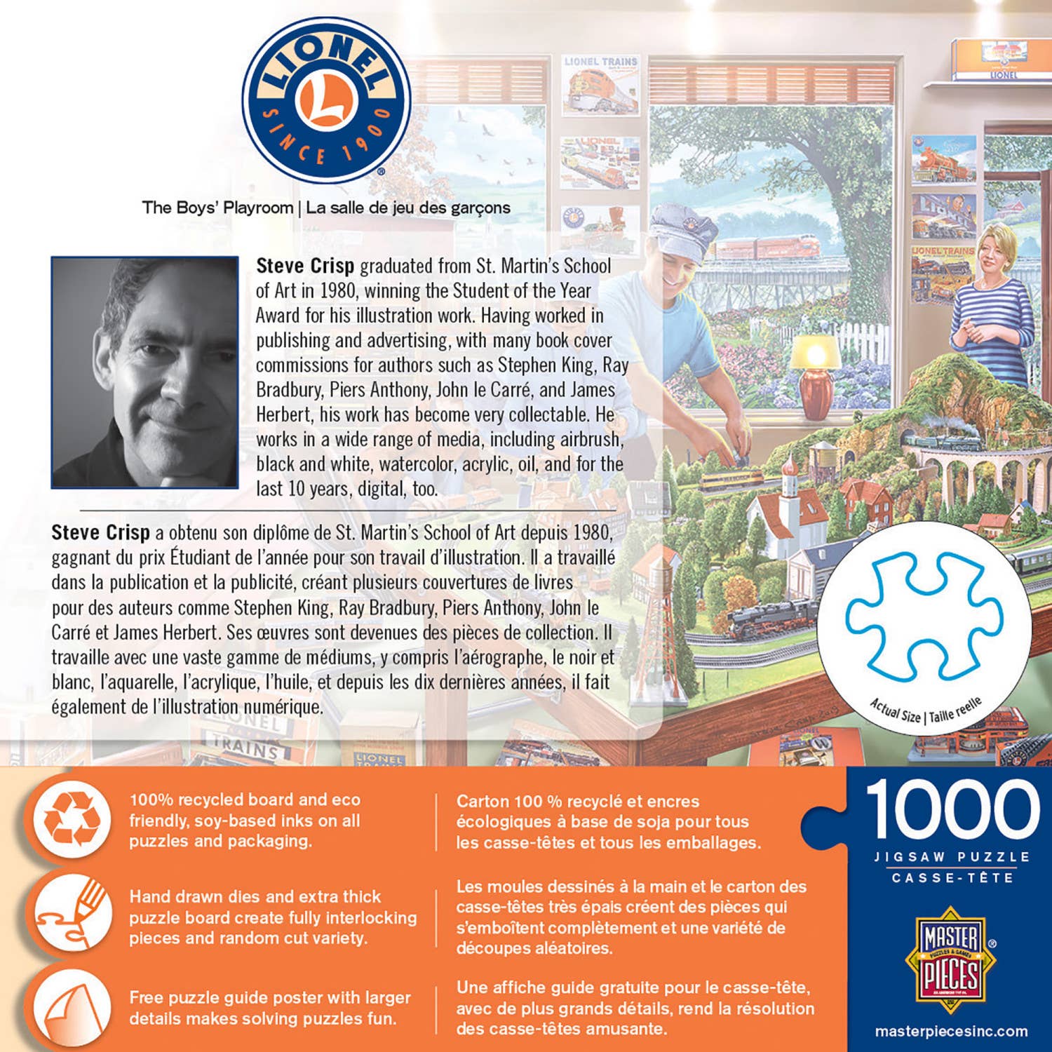 hese MasterPieces 19.25" x 26.75" 1000pc of Lionel features the essence of the a classic toy from the past. The family playroom has Lionel trains for all ages. To reduce their impact on our environment, the chipboard used in these puzzles is made of recycled material.